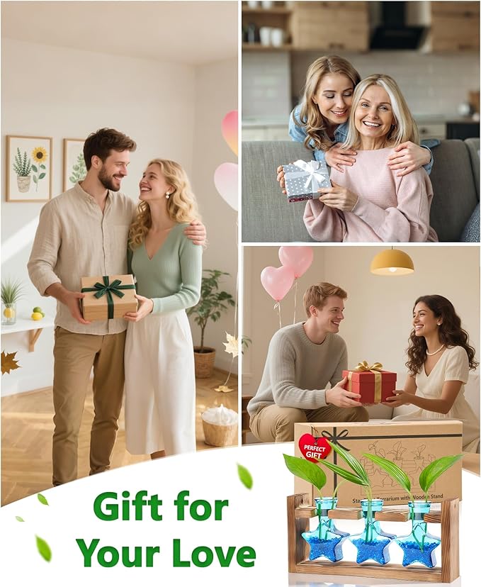 - Thoughtful Propagation Set:Our star shaped plant terrarium includes Natural wood stand, 3 star vases, cleaning brush, 200g decorative stones, illustrated guide. Everything for instant hydroponic setup! Transparent glass showcases mesmerizing root growth