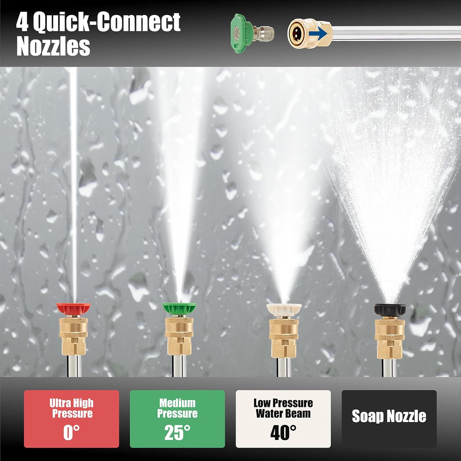 - ๐๐จ๐ฆ๐ฉ๐ซ๐๐ก๐๐ง๐ฌ๐ข๐ฏ๐ ๐๐ฅ๐๐๐ง๐ข๐ง๐ - This pressure washer has 4 quick-connect nozzle heads (0ยฐ, 25ยฐ, 40ยฐ, and soap) ranging from high-impact water jets to soft dispersion, perfect for cleaning decks, cars, house exteriors, outdoor furniture, and preparing your house exterior for painting. It can effectively remove dirt and grime from any surface in a short time.