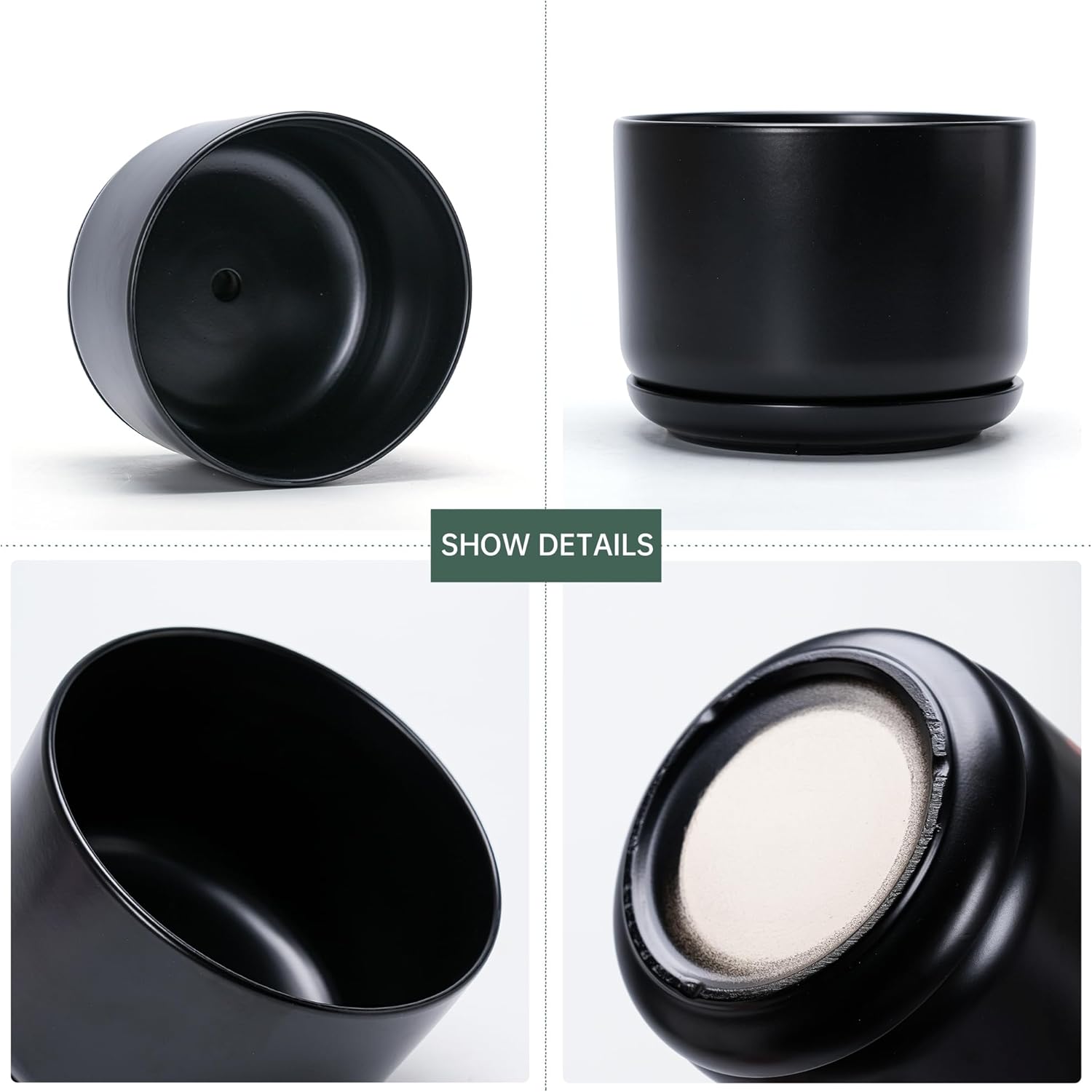 Ton Sin Plant Pots, 4.1+5.1+6.5 inch, Set of 3, Ceramic Planters with Drainage Hole and Saucer, Indoor Flower Pot with Hole Mesh Pad, Gifts for Mom(Matte Black)