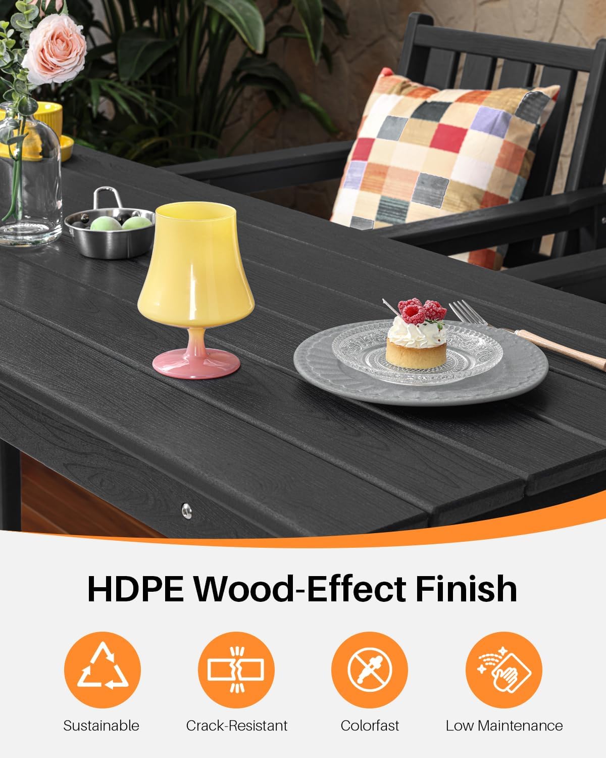 - Elegant Woodgrain Finish in Obsidian: Featuring a sleek obsidian black textured HDPE lumber surface that mimics real wood grain, this rectangular Adirondack outdoor bar height table offers a sophisticated yet durable addition to any outdoor setting. Designed to resist UV damage, moisture, and everyday outdoor wear, it’s perfect for patios, decks, and pool areas.