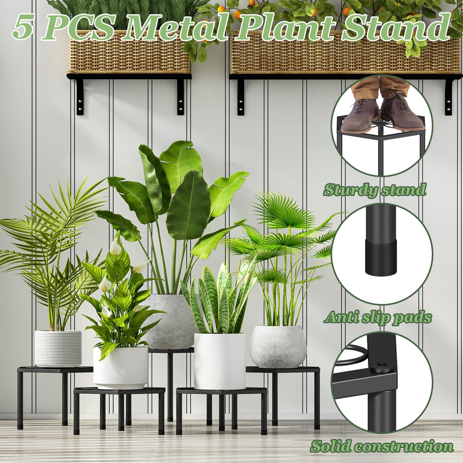 - 5-Pack:Package includes 5 metal plant stands for indoor and outdoor use. Each metal plant stand has different size to fit different sizes of flowerpots. and made of high-strength metal, not easily deformed. It is very suitable for heavy flower pots or other flower pots