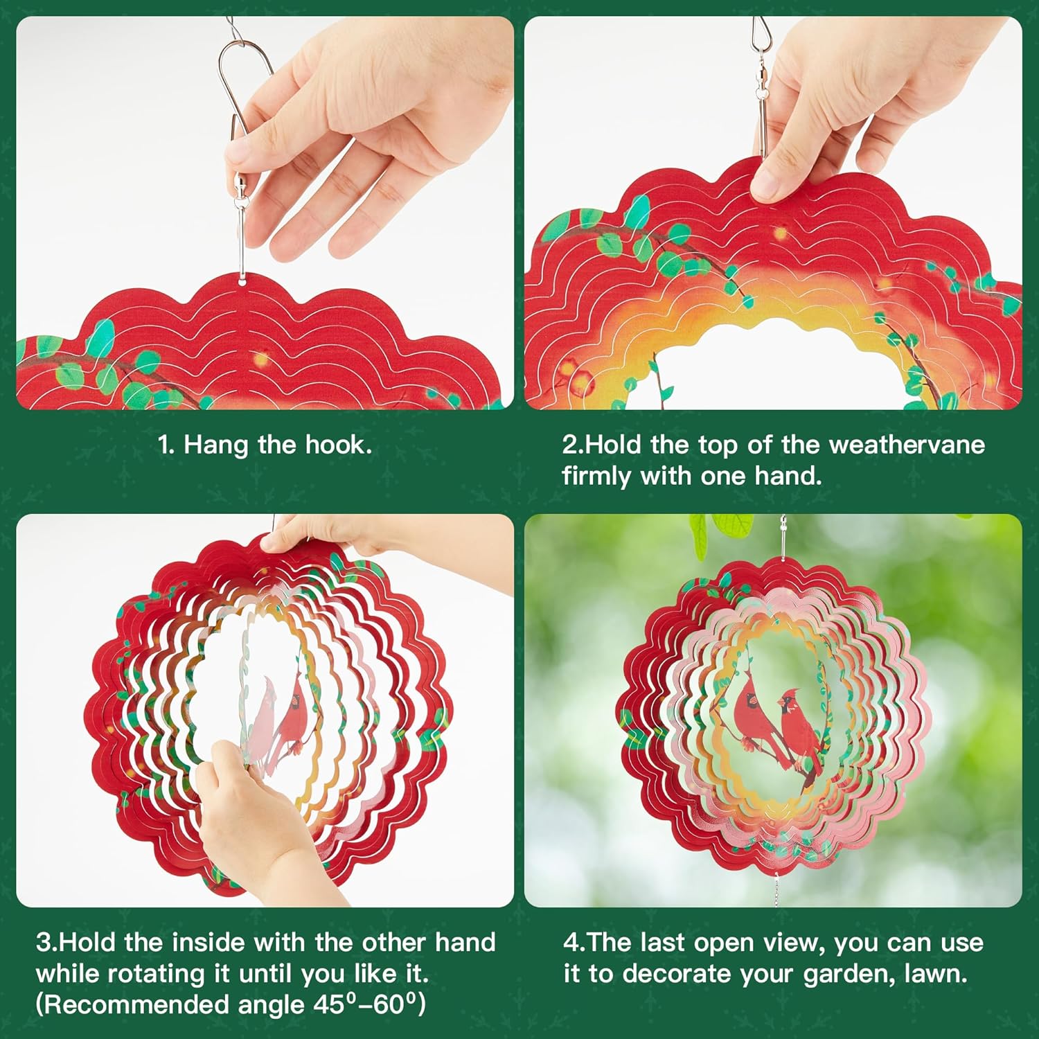 - Easy to Use: The initial state of this garden wind vane is flat. Just follow the instructions to turn it into a wonderful 3D sculpture decoration. The method is as follows: Hang the hook and hold the top of the wind spinners firmly with one hand while rotating it with the other until you reach your desired angle (suggested angle: 45–60°).