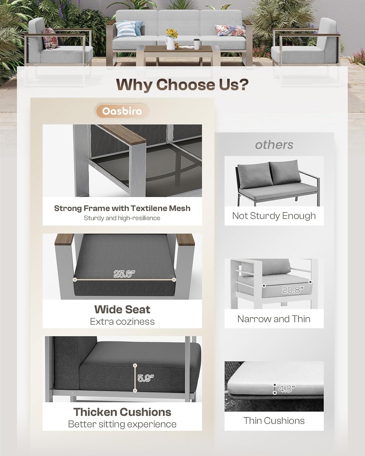 - Spacious Seating: Each seat in the Oasbira patio furniture set measures a generous 23.6"* 27.6", offering ample room to stretch out and relax. Whether you’re unwinding daily or hosting relatives and friends, it comfortably accommodates all body types for a truly great experience