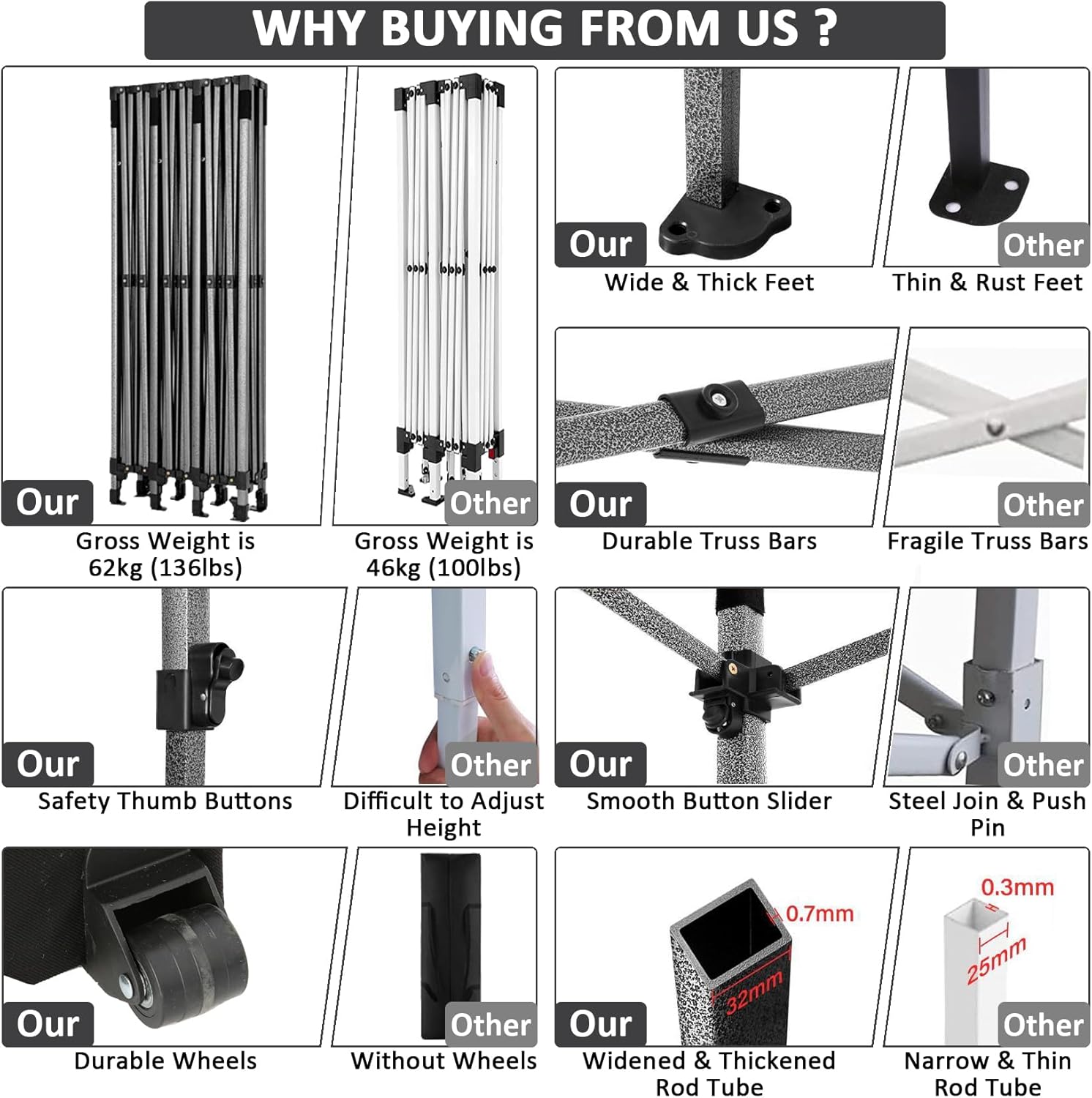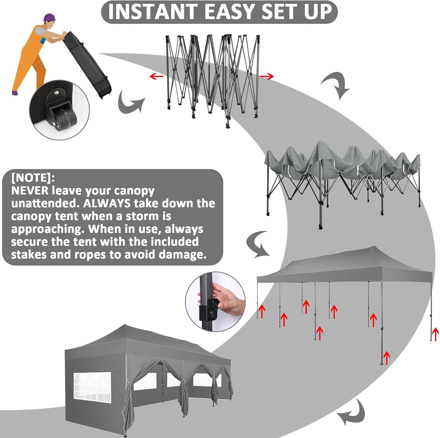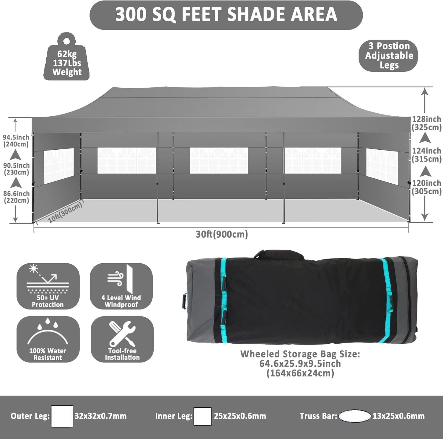 - 【3 Height Settings】10x30 pop up party tent straight leg has 3 height settings. Thumb latch lock system easy to lock and release, raise the pop up tent to a desired height. Canopy tent 10x30 straight leg height options: 220cm/86.6inch, 230cm/90.6inch, 240cm/94.5inch. Corresponding party tent center height options: 305cm/121.1inch, 315cm/124.0inch, 325cm/128.0inch. 10x30 canopy with sidewalls perfect for commercial activities, camping, festivals, tailgating, backyard events and etc..