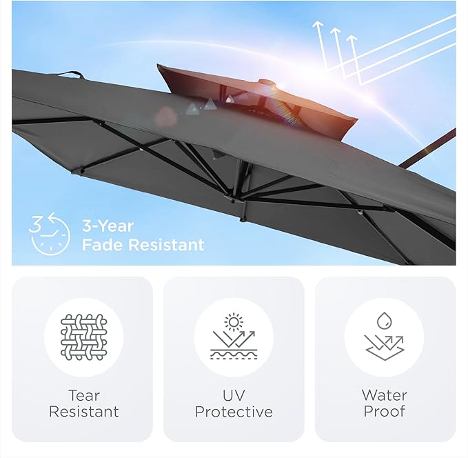- Winds Vents: Unique double top design reduces the impact of strong winds on the offset patio umbrella while also promoting air circulation, while adding stability; We recommend using this large outdoor umbrella in winds under 20 mph