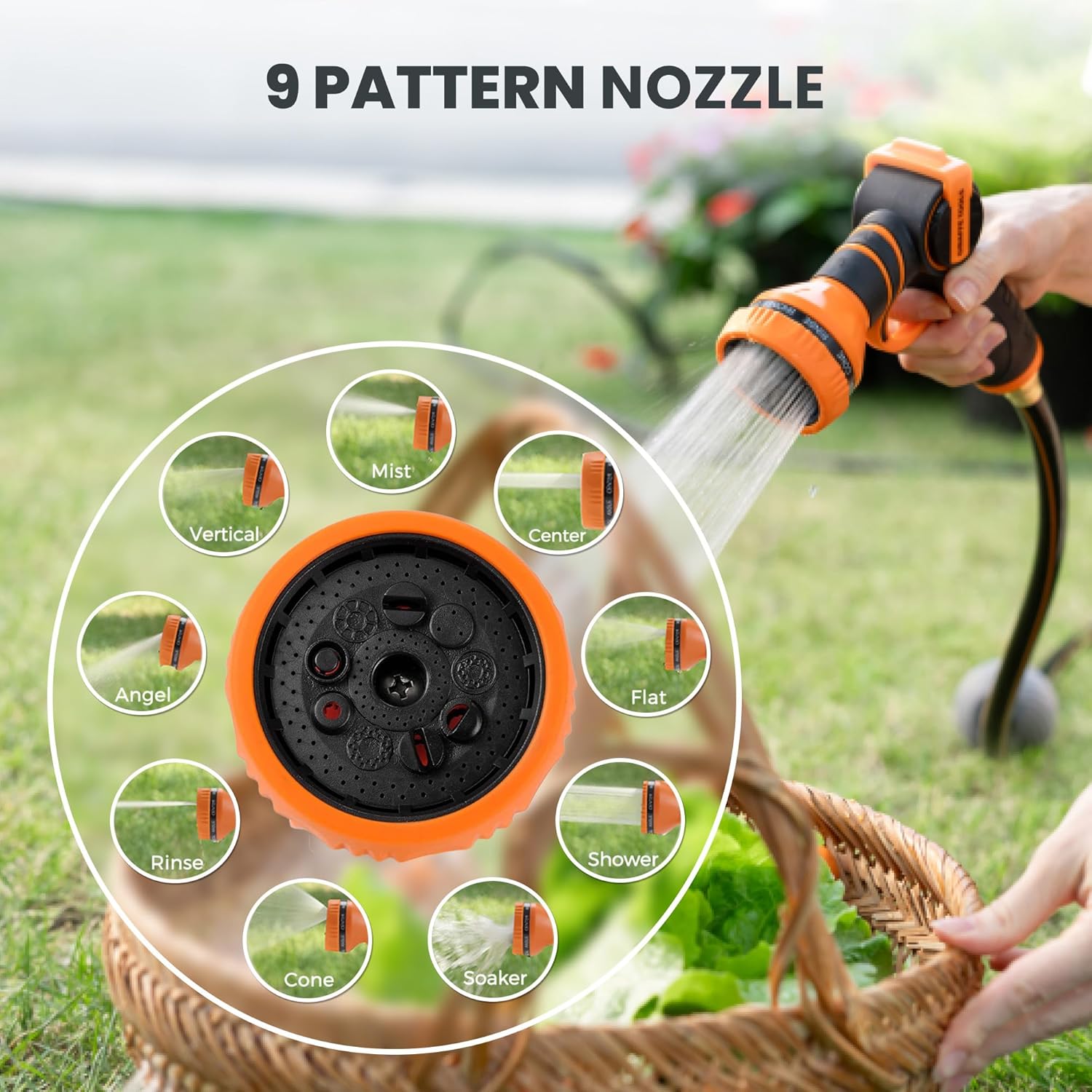- 9 Adjustable Spray Patterns: Garden Hose nozzle supports 9 patterns to fulfill your different watering purposes. Can be used for car washing, watering, cleaning, pet bathing, etc.