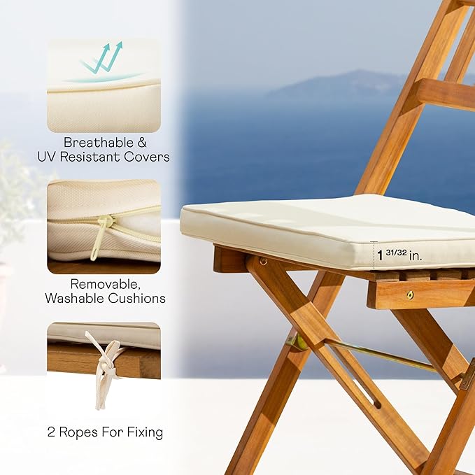IDZO Serene Bistro Set – 2-Piece Foldable Acacia Wood Chairs with Cushions, FSC-Certified Durable Construction, Space-Saving Outdoor Seating for Balcony, Garden, Patio, or Porch
