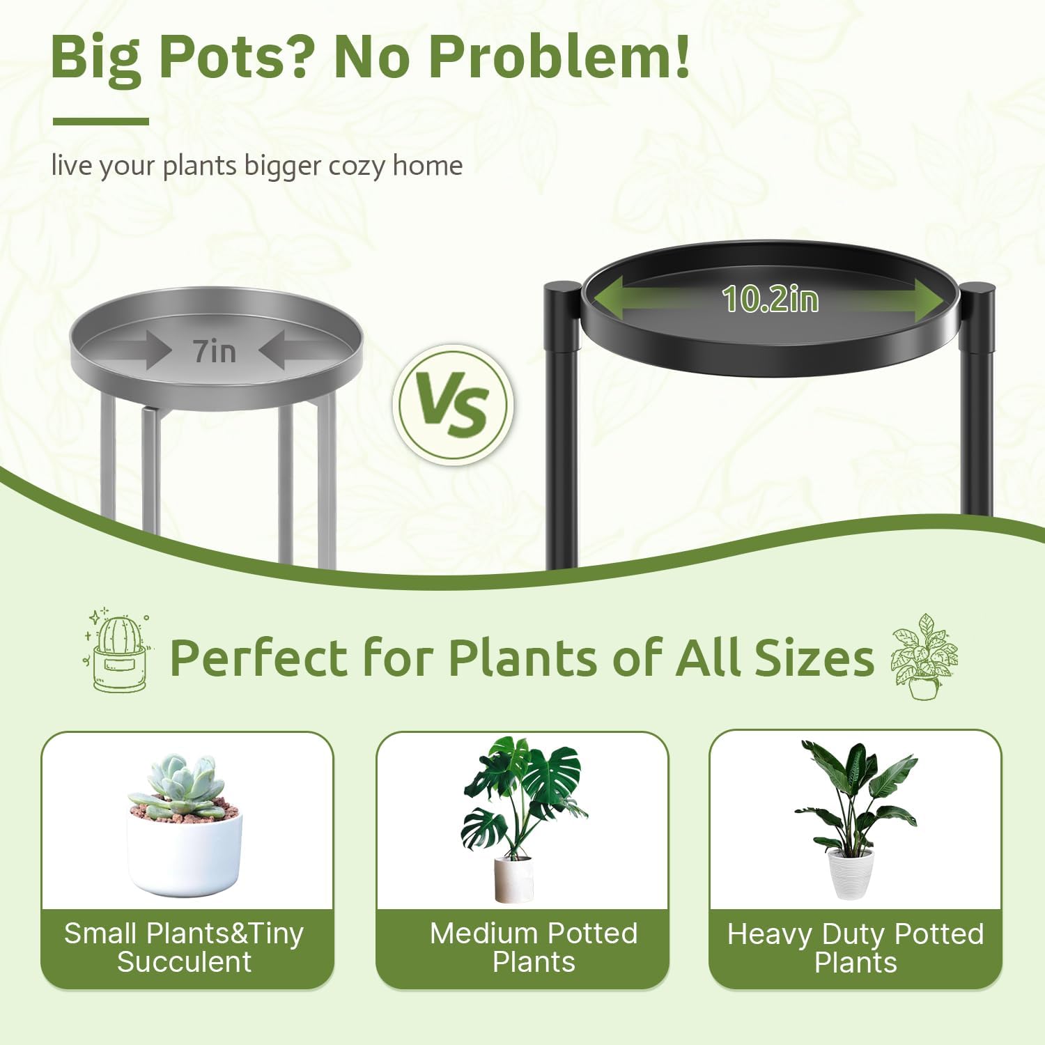 - [Big Pots? No Problem] Designed for large-capacity plant lovers, this unique plant stand with upgraded metal trays hold pots up to 10 inches and the bottom wooden board accommodates heavy-duty pots up to 11.8 inches in diameter. Perfect for everything from small succulents to large pots, making it ideal for all your planting needs!