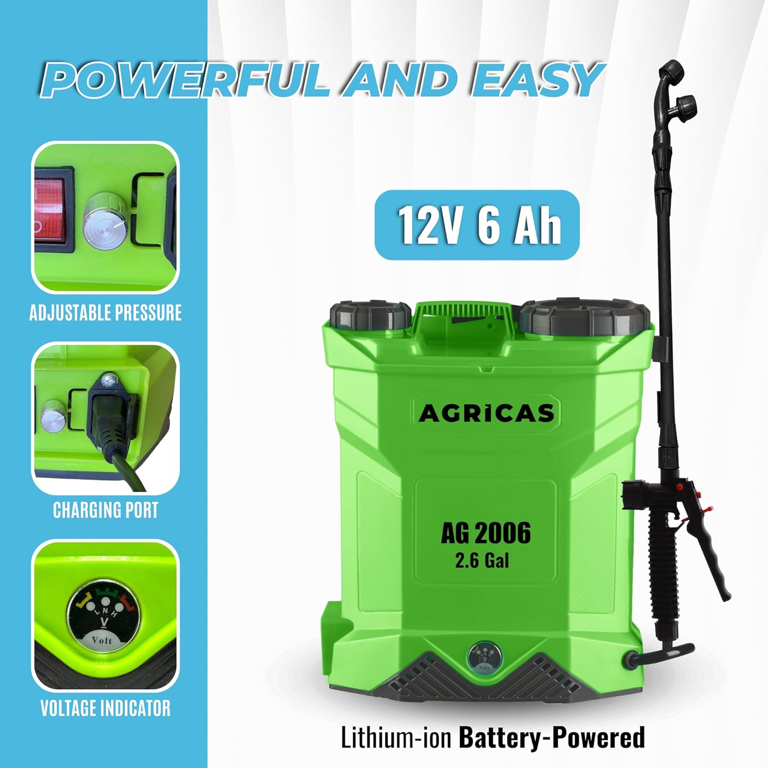 - Long-Life Battery: Equipped with a 12V 6Ah Lithium-Ion battery, the AG2006 provides extended usage time without frequent recharging. The included UL Certified charger ensures safe and efficient charging.