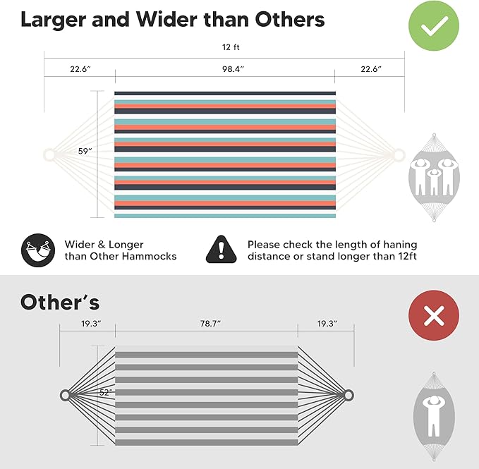 - Larger Bearing Capacity: The heavy duty hammock's total length (from loop to loop) is 144 Inches while the bed size is 98”long X 59”wide, making it perfect for couples