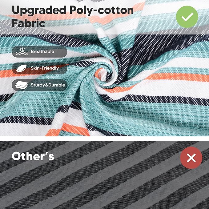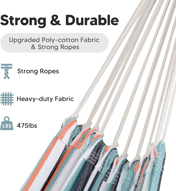 - Upgraded Fabric: Our Brazilian Camping hammock is made of eco-friendly thicker version poly-cotton fabric (no lint, no odor, not pilling, not fading, skin-friendly, and breathable), stronger and much more durable than ordinary fabric hammocks. A comfortable cocoon style hammock can keep you safe while enjoying the peaceful leisure time