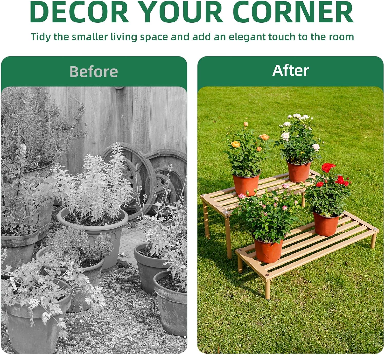 - Sleek and Modern Design: With its sleek Plate aroove processing and minimalist design, the plant stand adds a touch of modern elegance to any space. Whether placed in your living room, balcony, or garden, it effortlessly complements various decor styles, enhancing the aesthetic appeal of your plant display.