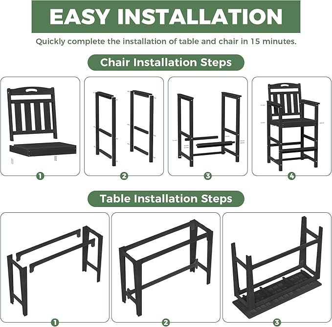 - 【All-Weather, Low-Maintenance HDPE】 Engineered to endure! Unlike rust-prone metal sets, our 100% recycled HDPE resists rain, UV damage, and extreme temperatures. No sealing/repainting—just wipe clean with soapy water. Ideal for busy households, this set maintains its appearance for years indoors or outdoors.