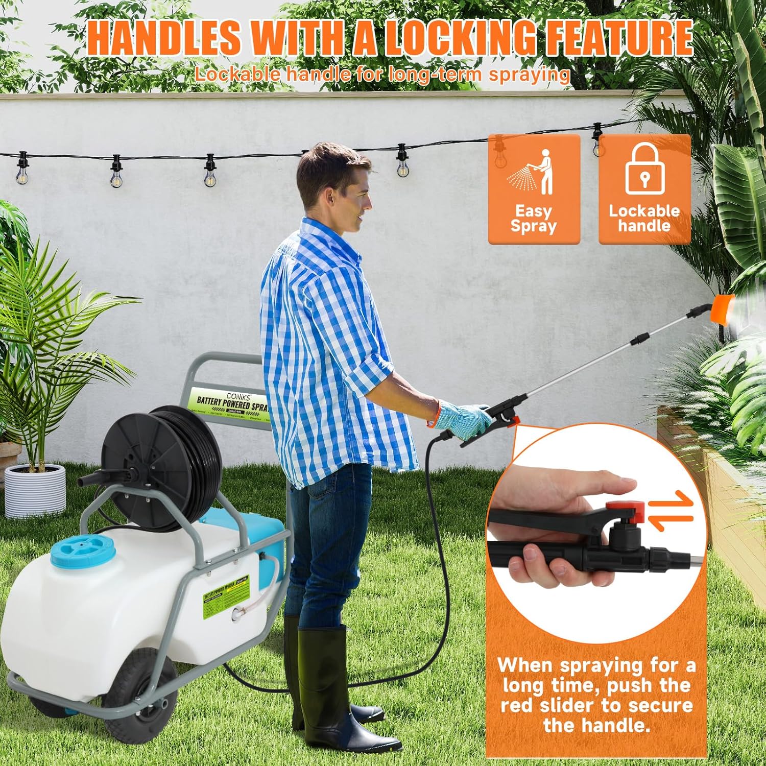 - 【164FT Hose】- Cover more ground effortlessly with the longest sprayer hose on the market (164 feet)! The kit includes a commercial-grade wand, ergonomic trigger sprayer, and 10 interchangeable nozzles. A built-in storage reel keeps hoses and accessories organized and tangle-free.Whether for indoor cleaning, outdoor gardening watering, vehicle washing, or pet care, this portable sprayer with wheels can meet your diverse needs, making daily spraying tasks more efficient and effortless!