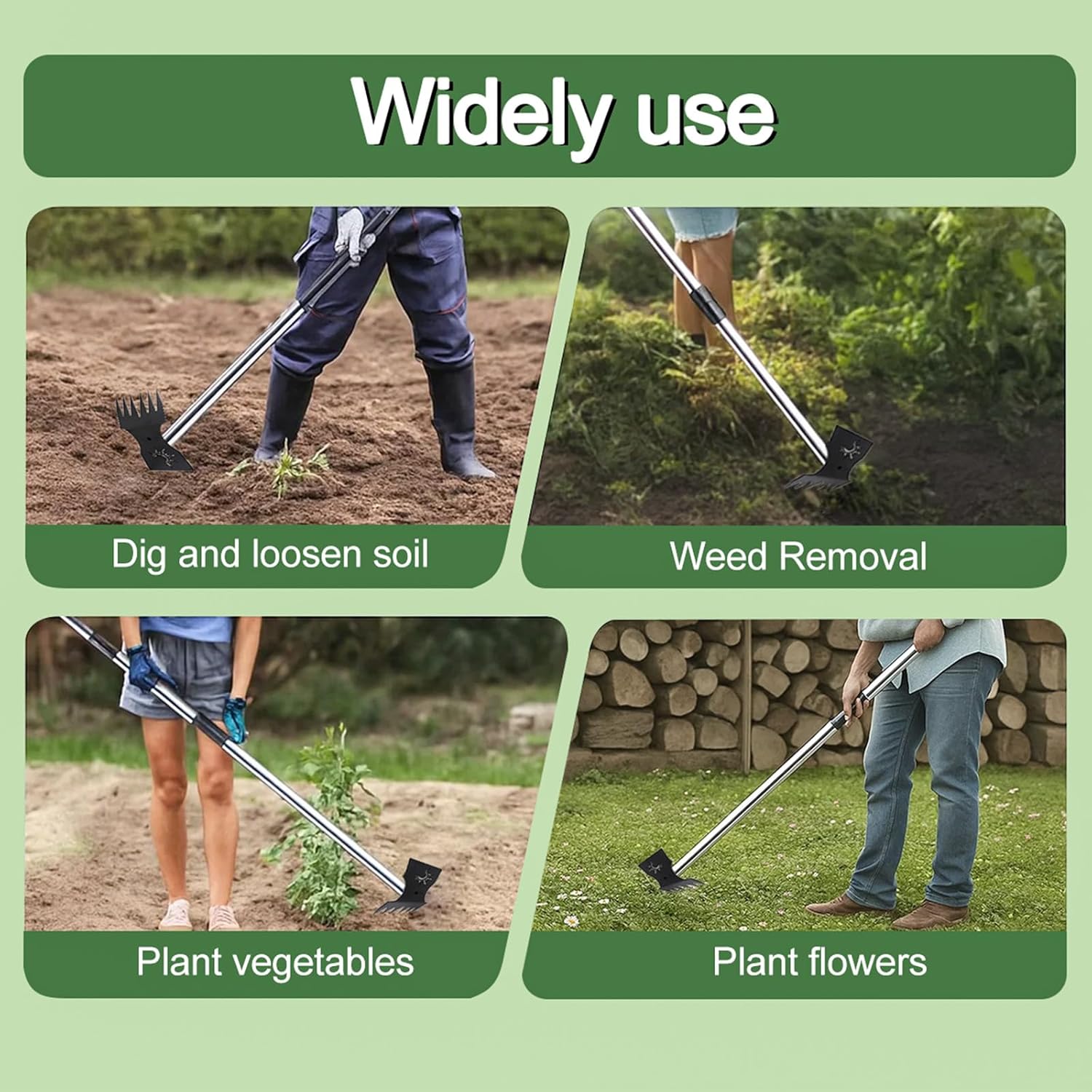 - Versatile 2-in-1 Garden Tool – This stand-up weeder efficiently removes tough weeds like crabgrass, clover, and dandelions while doubling as a handy garden hoe for soil loosening, digging, and leveling. Perfect for gardens, yards, lawns, patios, and farms - your ultimate all-in-one manual weeding solution
