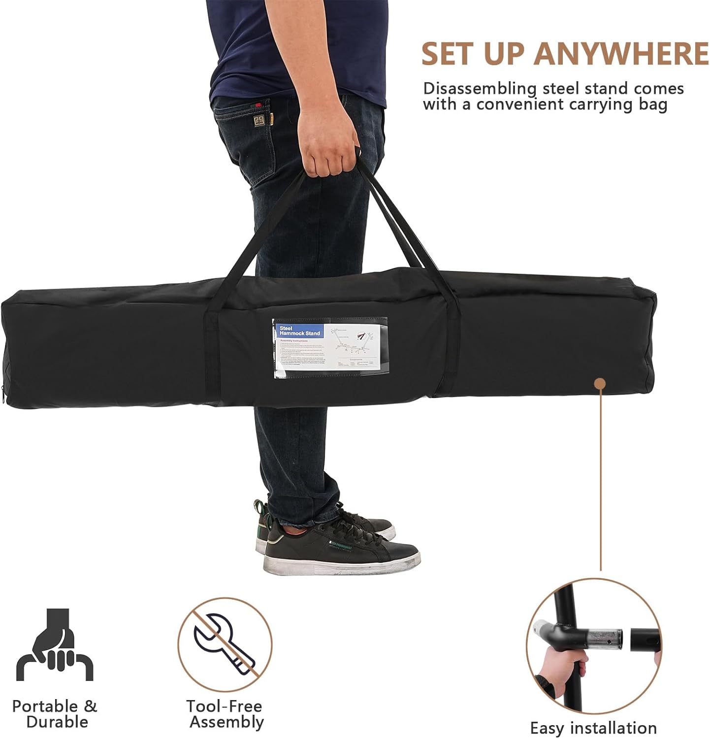 - HEAVY DUTY DOUBLE HAMMOCK:It has the stronger and durable steel stand, a hook with a metal buckle. 450-pounds weight capacity easily accommodates up to two people at once.
