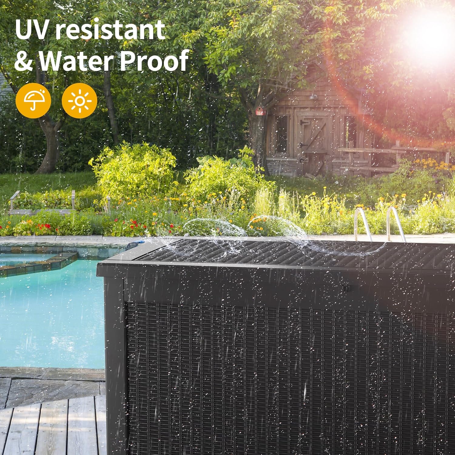 - Built to withstand any weather, our deck box is made from resin that offers waterproof, corrosion-resistant protection, and UV-resistant. No matter the season—be it scorching sun or heavy rain—this box will keep your items dry .