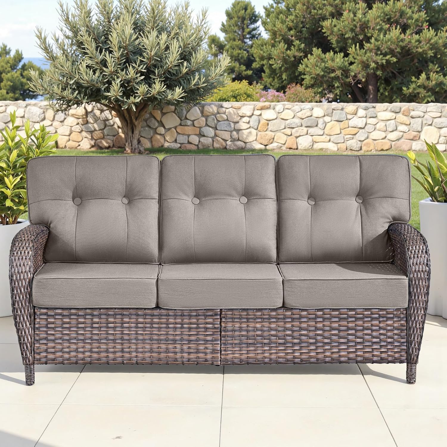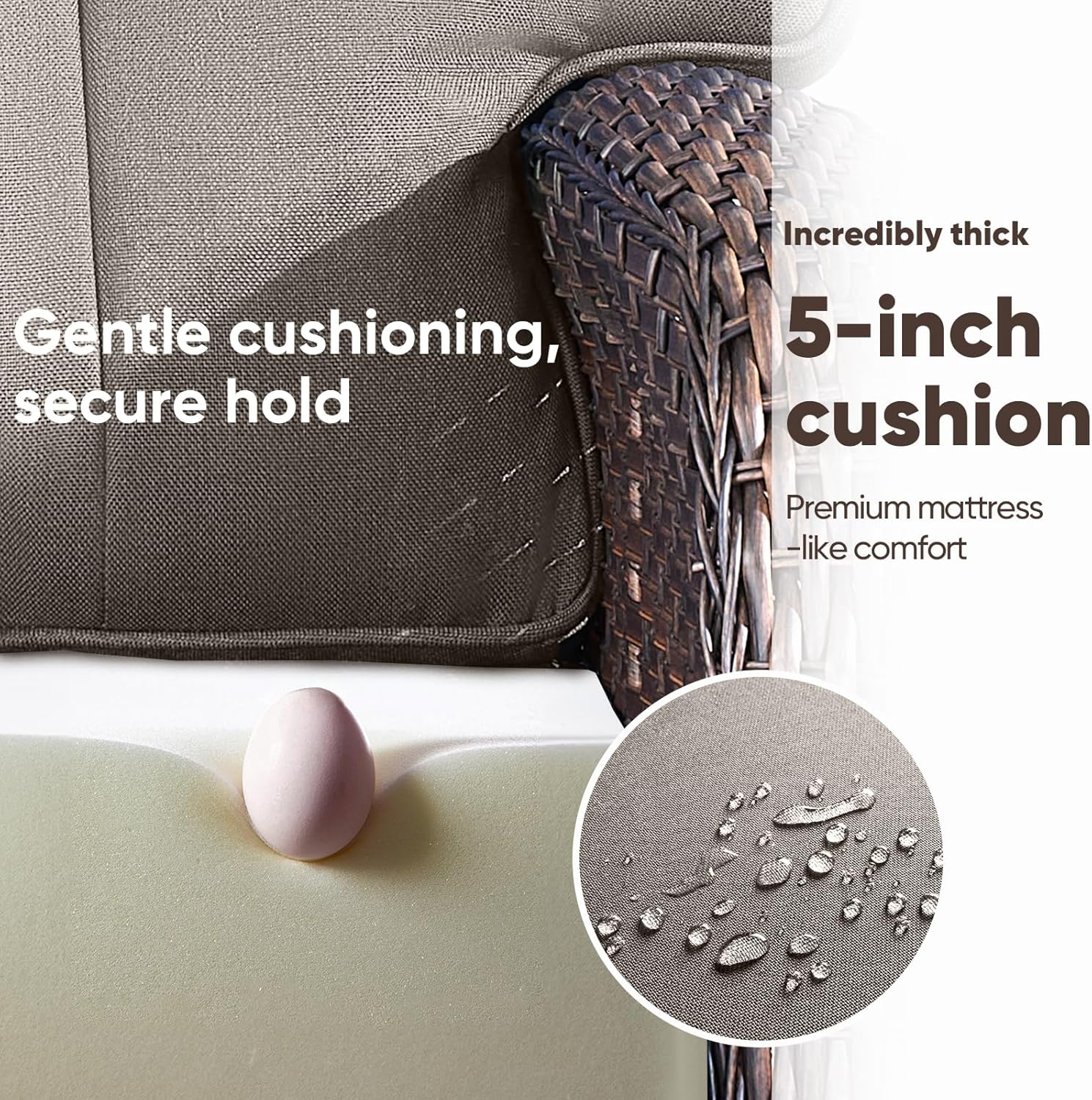 - 【Luxury T-shaped Wide Cushion】: This wicker rocking chair features a 31-inch-wide backrest. The 5-inch cushion on the outdoor rocking chair swivel chair is made of high-density 28D foam, perfectly balancing softness and support. Its quick-rebound properties ensure long-term shape retention and comfort. The backrest is filled with three-dimensional spaced cotton. The cushion cover is made of premium OLEFIN fabric, offering UV resistance, waterproofing, and fade resistance. Compared to ordinary polyester fabric, it is more comfortable and durable