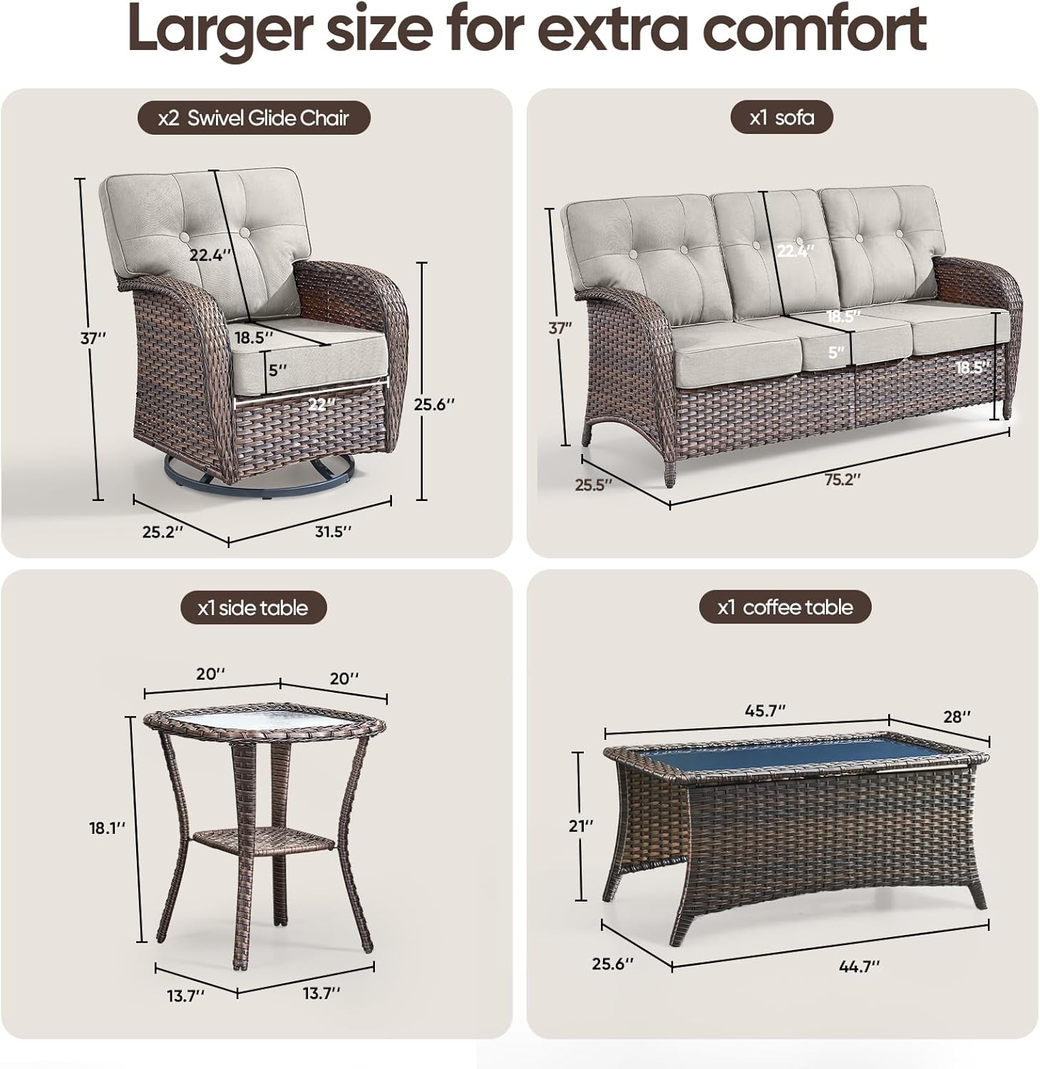 - 【Balcony Furniture Set Includes】: The 5-piece balcony furniture set includes 2 swivel chairs, 1 glass coffee table, 1 side table, and 1 sofa. The footstool can be used not only for relaxing your legs but also as a small table or stool. The swivel chairs can support up to 350 pounds.