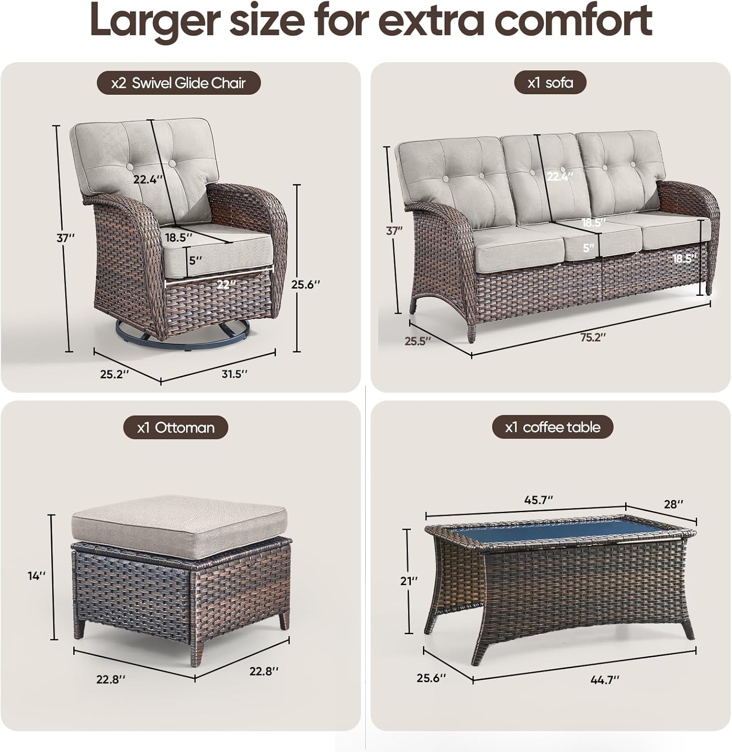 - 【Balcony Furniture Set Includes】: 6-piece balcony furniture set includes 2 swivel chairs, 1 glass coffee table, 1 sofa, and 2 footstools; the footstools can be used not only for resting your legs but also as a small table or stool. The swivel chairs can support up to 350 pounds