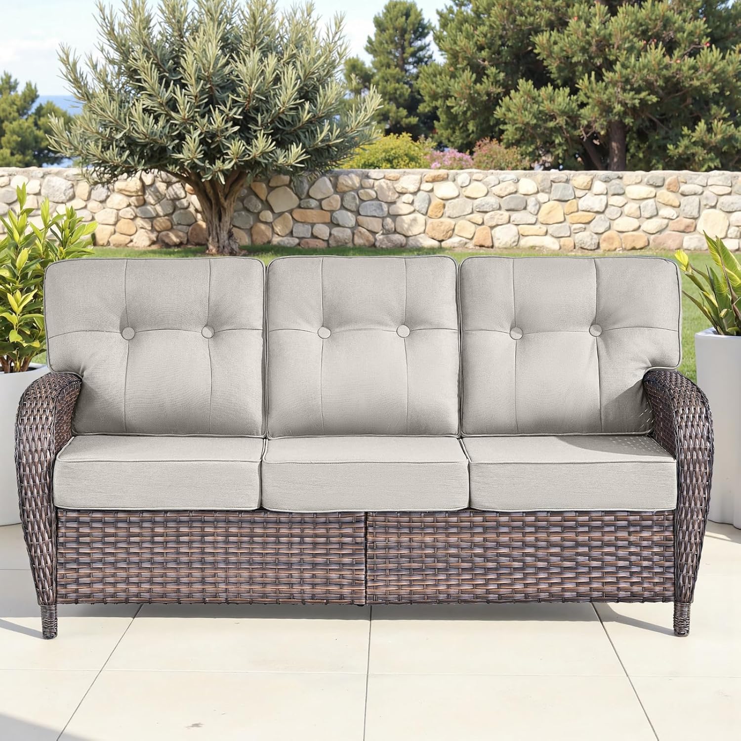 - 【Luxury T-shaped Wide Cushion】: This wicker rocking chair features a 31-inch-wide backrest. The 5-inch cushion on the outdoor rocking chair swivel chair is made of high-density 28D foam, perfectly balancing softness and support. Its quick-rebound properties ensure long-term shape retention and comfort. The backrest is filled with three-dimensional spaced cotton. The cushion cover is made of premium OLEFIN fabric, offering UV resistance, waterproofing, and fade resistance. Compared to ordinary polyester fabric, it is more comfortable and durable