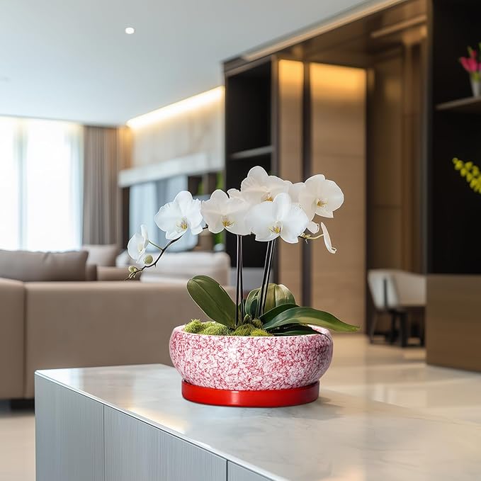 Succulent Pots - 8 Inch Bonsai Pots for Indoor Outdoor, Shallow Ceramic Planter with Drainage Hole and Saucer, Round Flower Succulent Planters, Room Decor, Gifts for Plant Lovers, Red