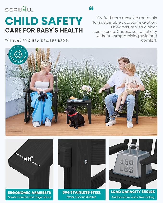 SERWALL Outdoor Rocking Bistro Set, HDPE Patio Furniture Set, Porch Rocking Chair Set with Table for Backyard, Balcony, and Garden- Black