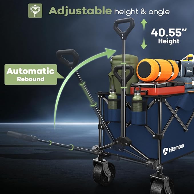 - ใ๐๐ซ๐ ๐จ๐ง๐จ๐ฆ๐ข๐ ๐๐ฎ๐ญ๐จ-๐๐๐๐จ๐ฎ๐ง๐ ๐๐๐ง๐๐ฅ๐ใ: This collapsible wagon features a self-rebounding handle. Adjust the handle to your preferred angle while pulling, and it automatically springs back upright when released. No bending or manual adjustments needed. Also, its easy maneuverability allows for smooth and effortless steering.