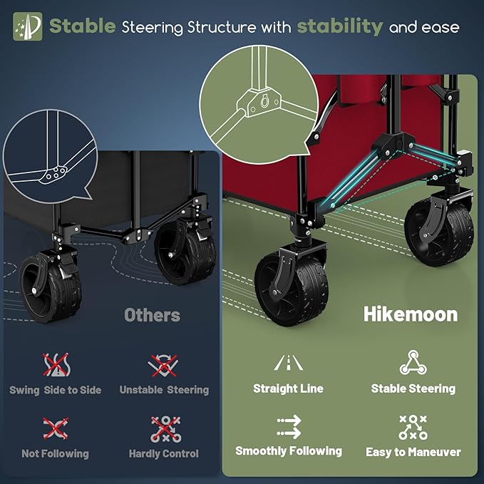 - ใ๐๐ข๐ ๐๐ฅ๐ฅ-๐๐๐ซ๐ซ๐๐ข๐ง ๐๐ก๐๐๐ฅ๐ฌใ: Equipped with 6" diameter and 2.5" wide big wheels, this wagon cart can easily pass over rough roads. The 360ยฐ swivel front wheels enable tight turns, while the shock-absorbing, wear-resistant treads handle sand, mud, grass, and gravelโperfect for outdoor trips or heavy-duty hauling.
