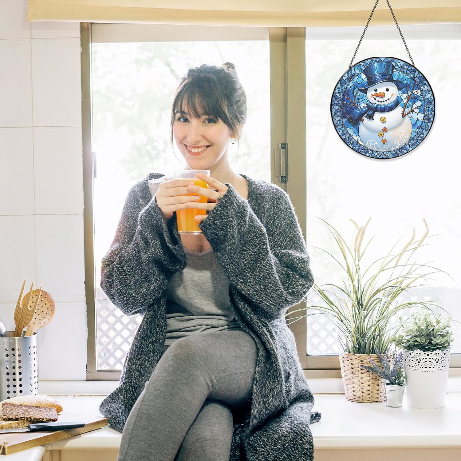 Stained Glass Window Hanging - Winter Snowman Suncatcher for Windows Hanging Whimsical Light Catcher Home Decor Terrace Garden Sun Catcher Gifts for Women Wife Mom Sister Nana 7.8 in