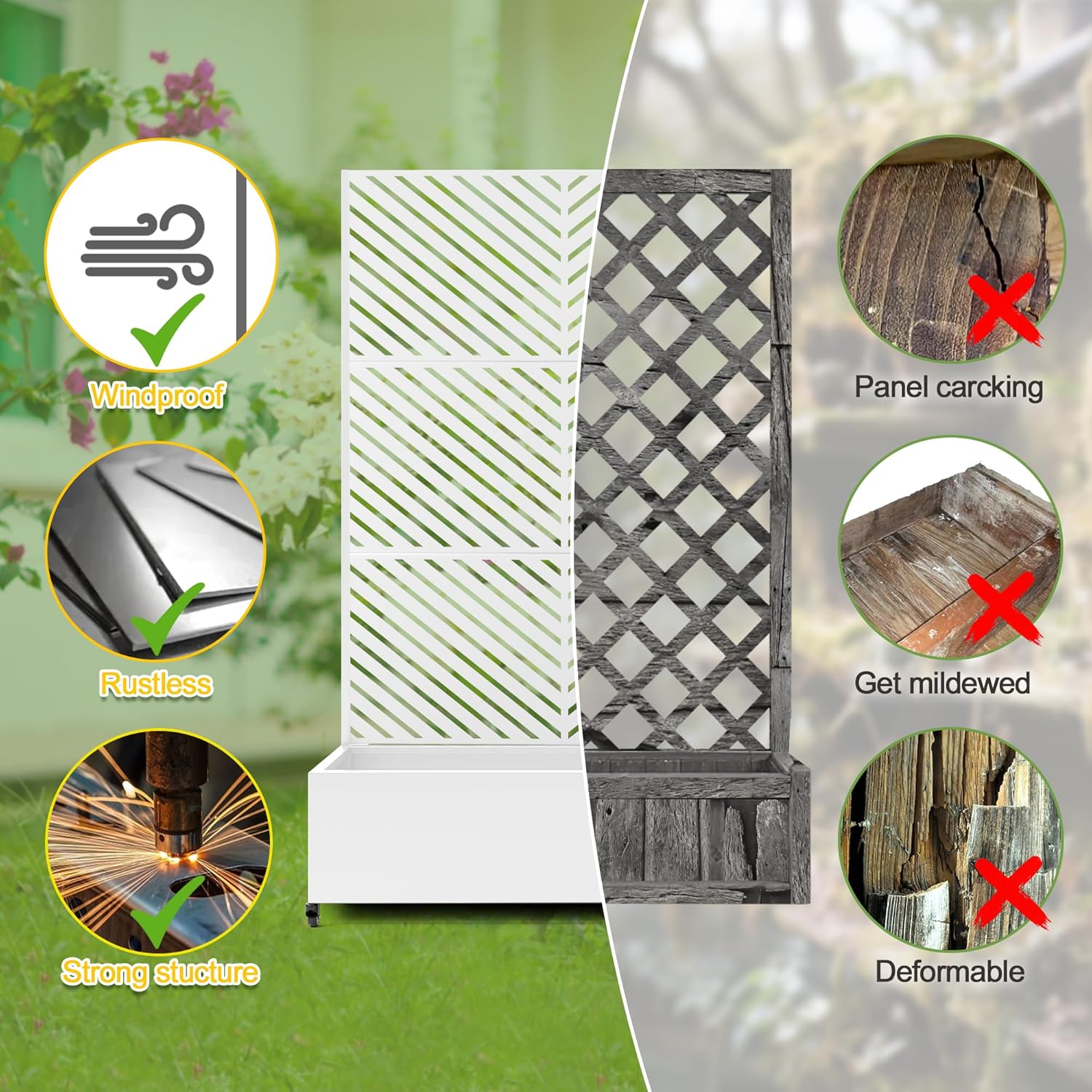 FENCY Metal Raised Garden Bed with Wheels and Trellis,73"x47"x16" Planter Box for Climbing Plants, Vegetables & Vines, Features Privacy Screen and Drainage Holes (White-Arrow)
