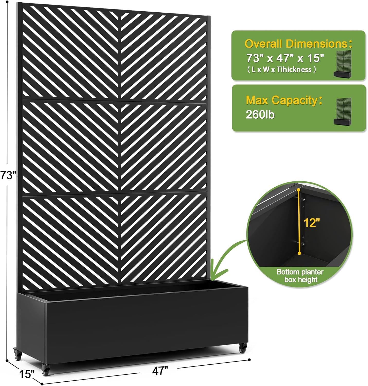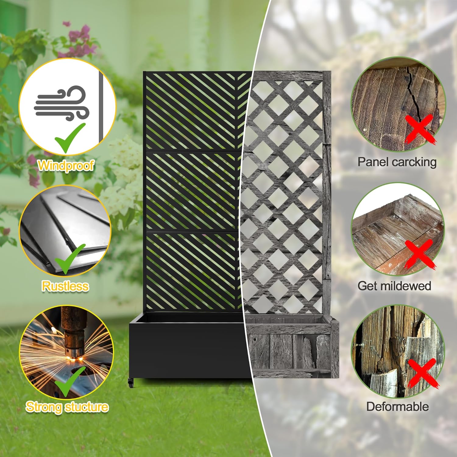 FENCY Metal Raised Garden Bed with Wheels and Trellis,73"x47"x16" Planter Box for Climbing Plants, Vegetables & Vines, Features Privacy Screen and Drainage Holes (Black-Arrow)