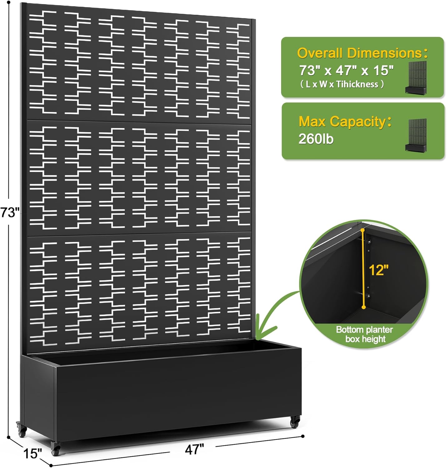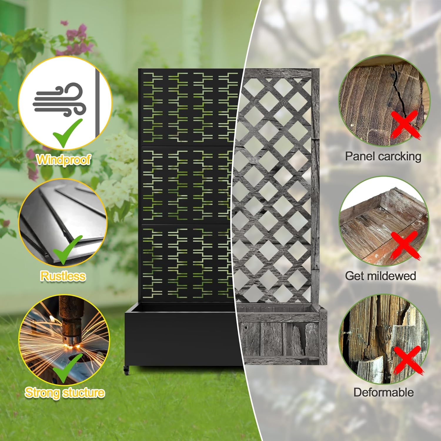 FENCY Metal Raised Garden Bed with Wheels and Trellis,73"x47"x16" Planter Box for Climbing Plants, Vegetables & Vines, Features Privacy Screen and Drainage Holes (Black-Brick)