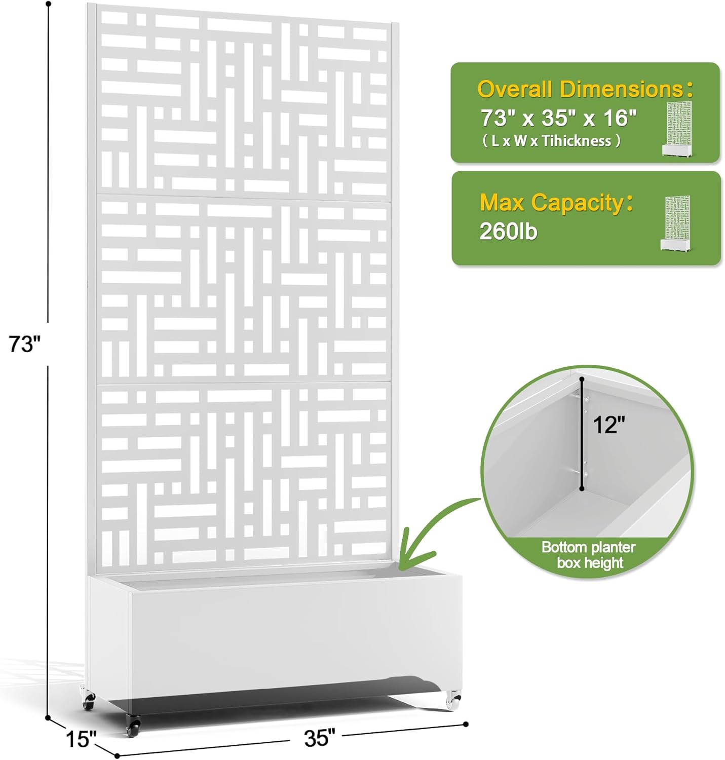 FENCY Metal Raised Garden Bed with Wheels and Trellis,73"x35"x16" Planter Box for Climbing Plants, Vegetables & Vines, Features Privacy Screen and Drainage Holes (White-Geometric Lattice)