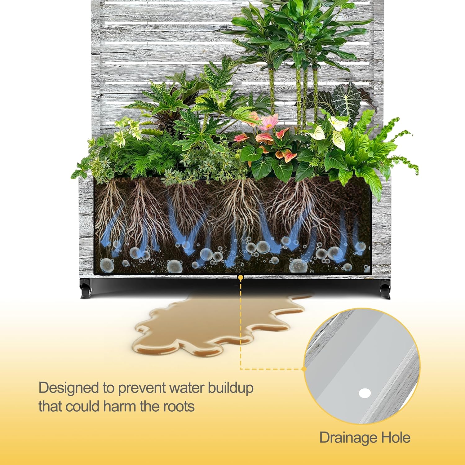 - Built-in Drainage System This planter box features a 12-inch deep planting bed equipped with drainage holes to effectively prevent water accumulation, ensuring plants receive the proper moisture for healthy growth. This design helps maintain optimal soil moisture levels and avoids issues caused by overwatering.