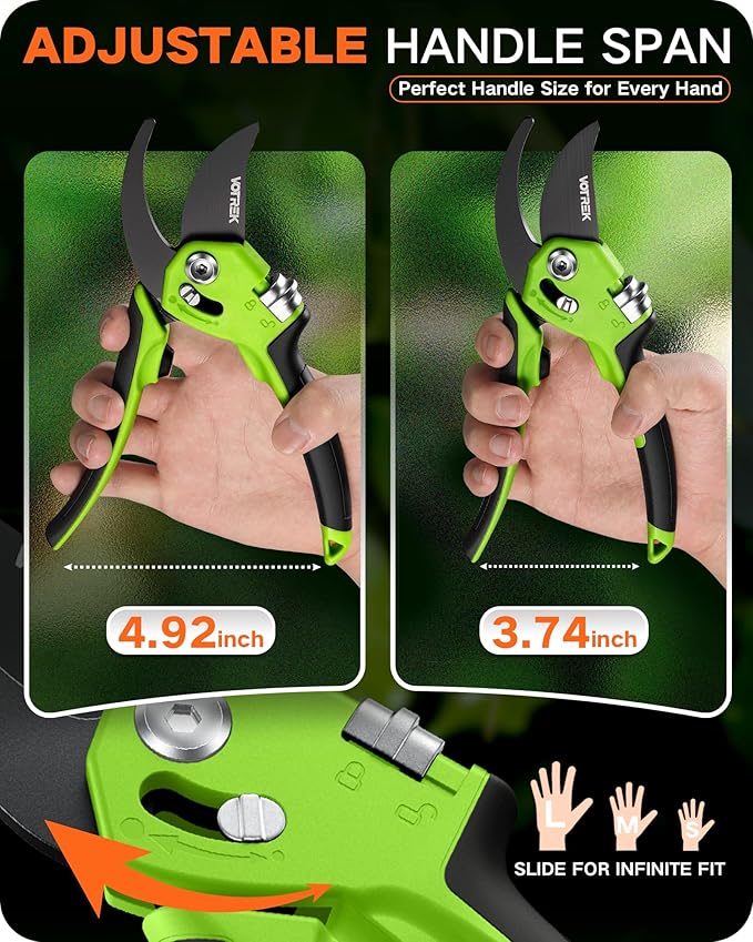 - 【Adapts to All Hand Sizes】VOTREK professional garden shears feature a dual adjustment system for cutting width and handle spacing—no tools required, quickly adapting to hand sizes from S to XL. The one-handed design allows users with smaller hands (including women) to easily and comfortably trim branches, shrubs, and roses. Perfect for the whole family, making gardening a shared joy