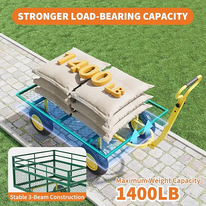 - 【1400 Lbs heavy-duty load capacity】This garden cart is specially designed for heavy loads and can easily carry heavy items such as soil, rocks, or heavy tools. With a super-strong load capacity of 1400 lbs, it significantly reduces the number of trips back and forth, making outdoor work more efficient and easier. It is a practical helper for gardening and landscaping. (Note: Avoid prolonged overloading to extend its service life.)