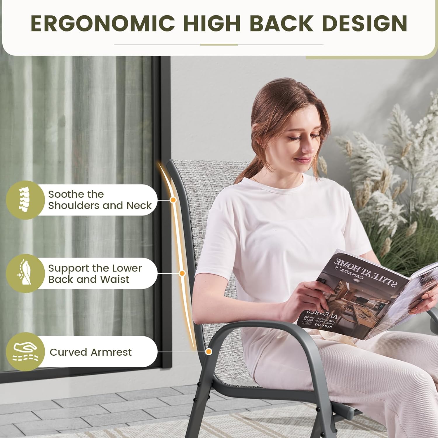 - 【WIDER SEAT & HIGH BACK】Our patio dining chairs are 20 inches wider than traditional 18-inch seating. It also features an ergonomic high back structure. The comfortable width of the chair seat and the contoured backrest make your leisure time more comfortable