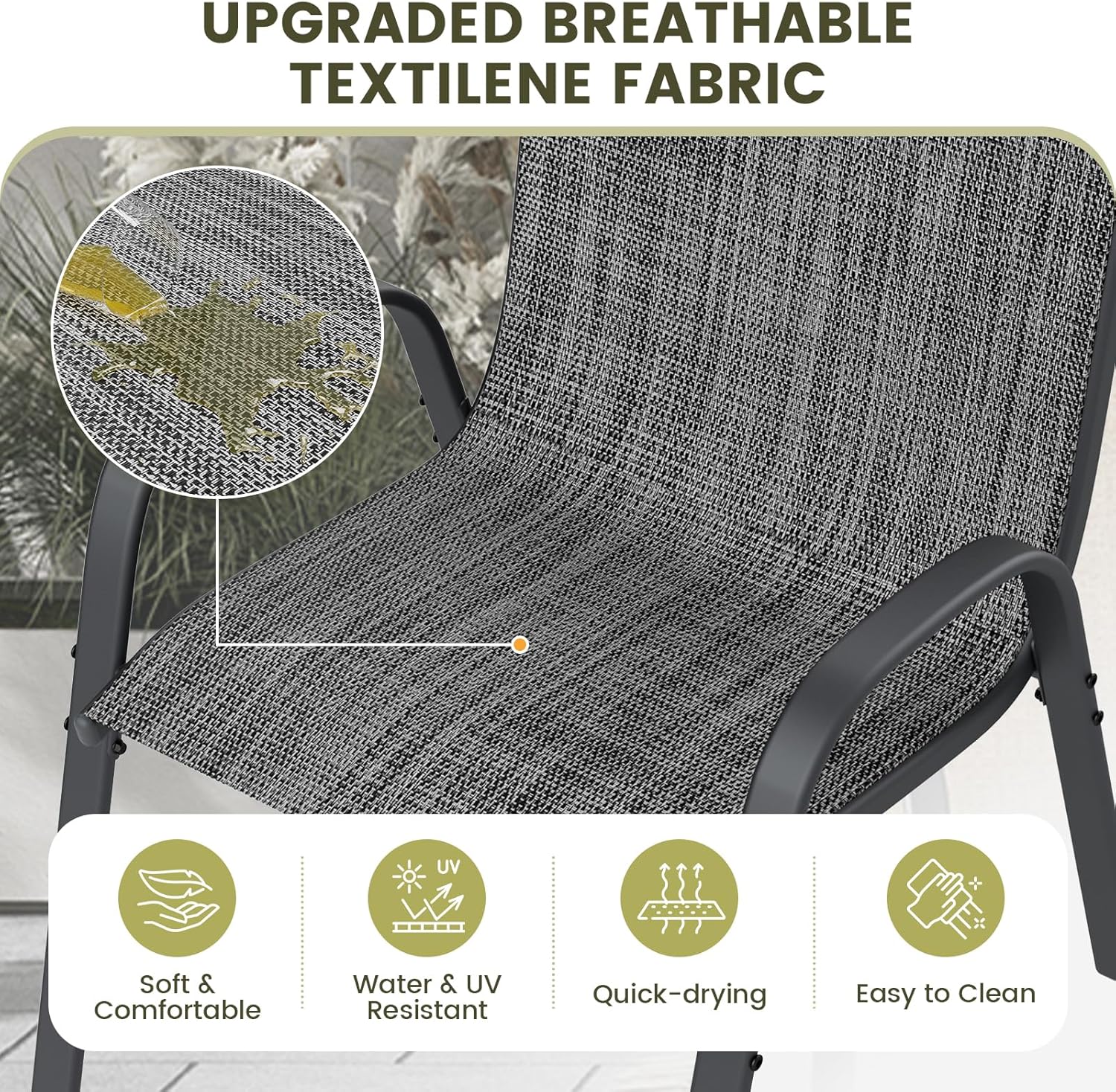- 【CAN BE USED ALL WEATHER】Our outdoor dining chairs are made with breathable, quick-drying Teslin fabric so you can leave these stackable patio chairs outdoors with peace of mind. With excellent fade resistance and durability, these comfortable outdoor chairs will look like new for a long time