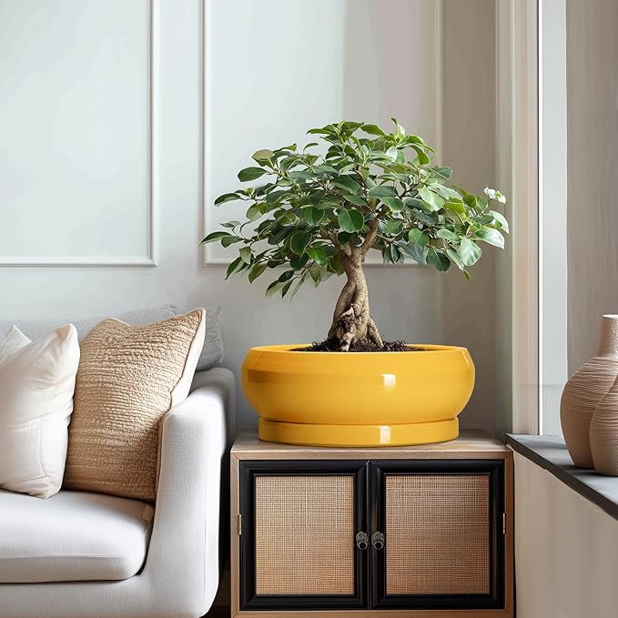 Ceramic Bonsai Pots - 13 Inch Large Succulent Pots with Drainage Hole and Saucer, Bonsai Planter for Indoor Outdoor, Round Shallow Bowl Planter, Garden House Decor, Plant Lover Gifts, Yellow
