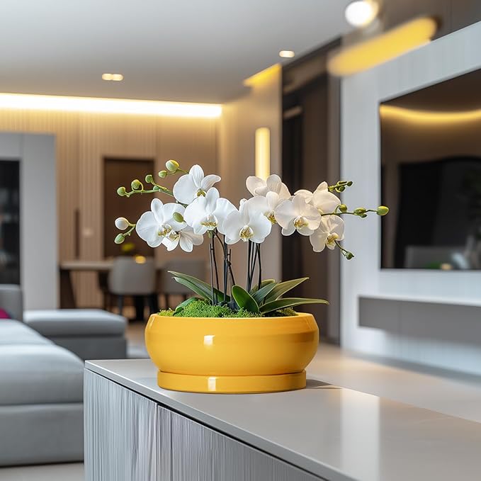 Succulent Pots 10 Inch - Ceramic Bonsai Pots with Drainage Hole and Tray, Shallow Plant Pot Indoor Outdoor, Modern Bonsai Tree Pot, Round Planter Bowl, Home Decor, Housewarming Gift, Yellow