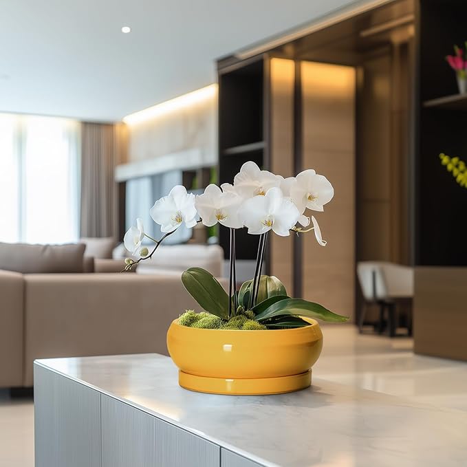 Bonsai Pots - 8 Inch Ceramic Succulent Planter for Indoor Outdoor, Shallow Planters with Drainage Hole and Saucer, Round Modern Planter Bowl, Window Decor, Gifts for Plant Lovers, Yellow