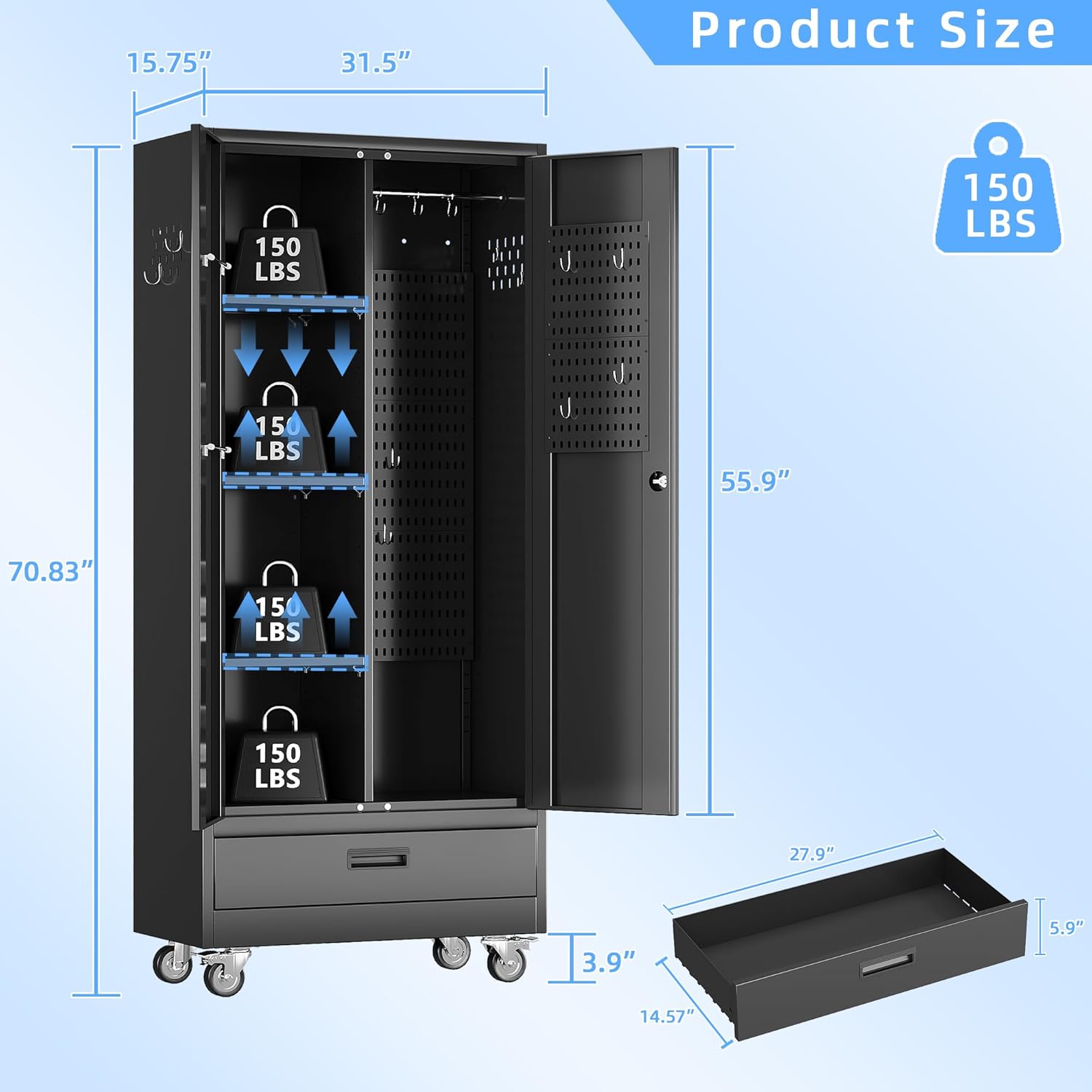 - [DIY YOUR STORAGE] Our storage cabinet provides 4 adjustable shelves, 3 pieces of Pegboard, 1 hanging rod, 2 towel rails, 6 hooks and 3 pegs, catering to your DIY needs. You can design a storage solution that perfectly fits your unique lifestyle and storage requirements.