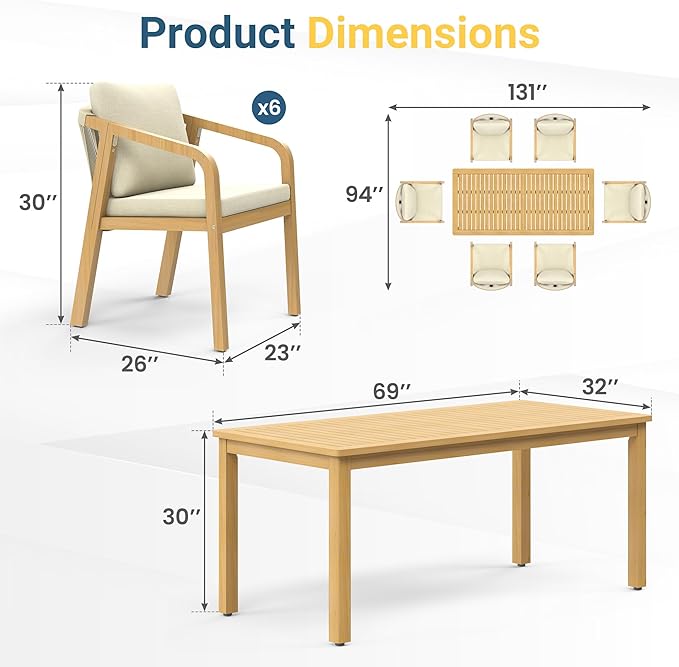 Wisteria Lane 7 Pieces Acacia Patio Dining Set for 6, Patio Dining Table and Chairs Set with Cushion, Modern Outdoor Dining Furniture Set for Lawn Backyard Garden Deck, Beige