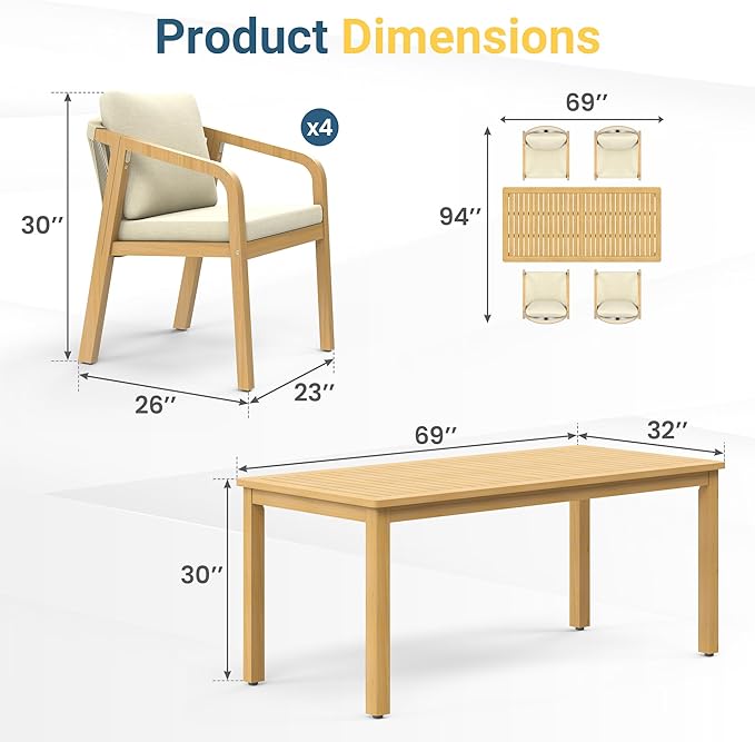 - 【Exceptional Strength and Durability】The frame is made entirely of premium acacia wood, a material renowned for its density and resilience. It effectively resists warping, cracking, and surface wear, making it particularly well-suited for high-use furniture such as patio dining table sets.