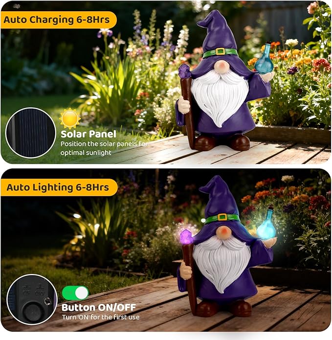 - Solar-Powered Gnome Outdoor Statue: This charming garden statue features a purple gnome lighting a magic bottle. More than just a decorative piece, it's fully solar-powered, requiring no cords or complicated setup. Just place it in a sunny spot to charge automatically – it's the perfect gnome outdoor statue for your garden, yard, or patio