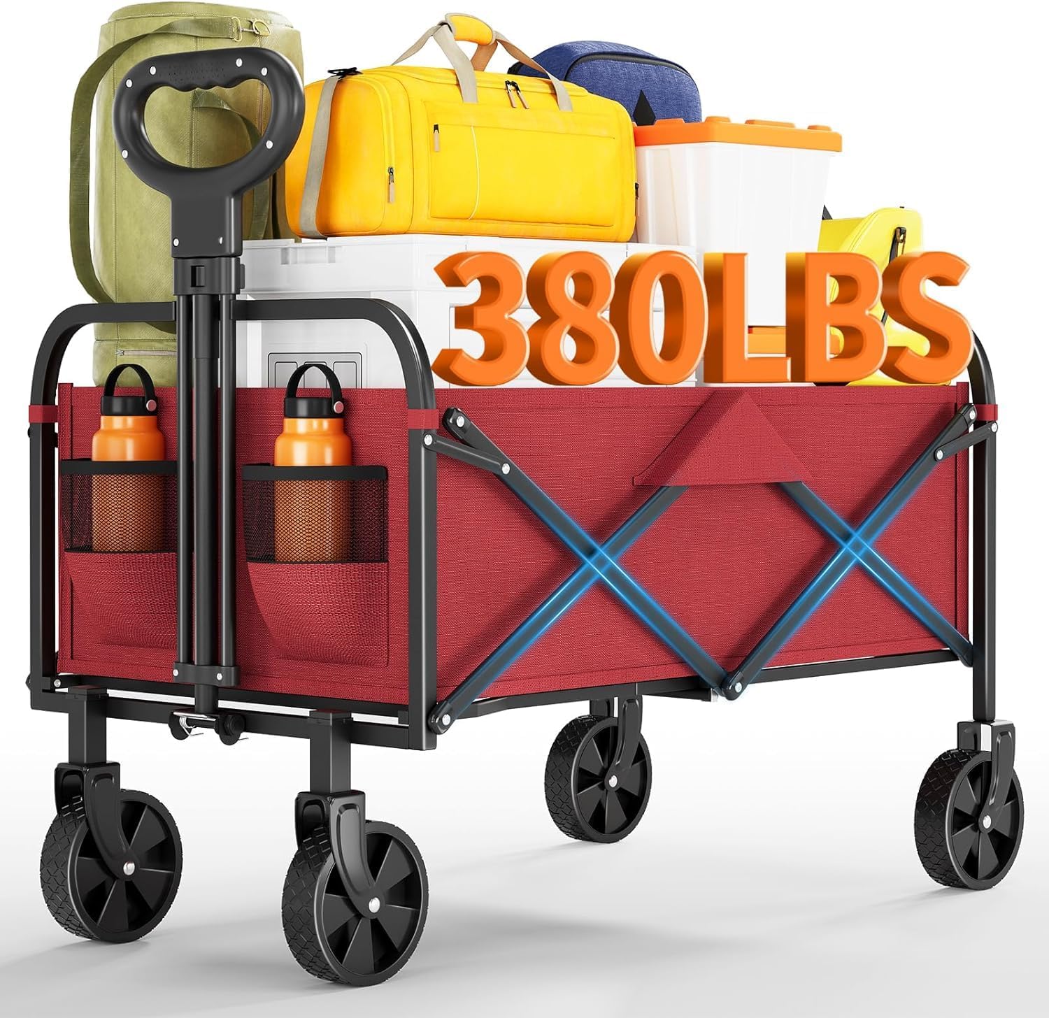 Foldable Wagon Cart, 380LBS Capacity Collapsible Wagon with All-Terrain Wheels, 220L Foldable Utility Cart & Grocery Cart on Wheels, Portable Lightweight 12LBS for Outdoor, Beach, Garden (Red)