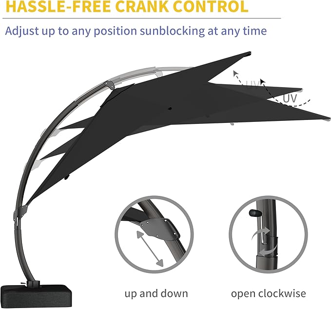 - 【360° Rotation & Infinite Tilt for Full Sun Control】Maximize shade coverage with smooth 360° rotation and precise infinite tilt adjustment. Easily block sunlight from any angle—perfect for poolside relaxation, patio dining, or backyard gatherings.