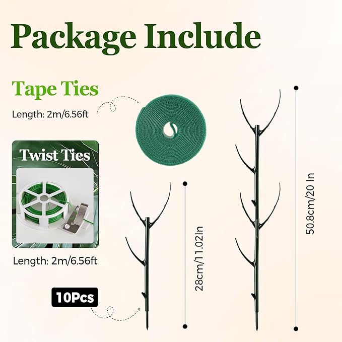 - 【Complete & Easy Setup Kit】Each set includes 10 branch-shaped 11in support stakes, 6.56ft(2m) feet of green tape, and twist ties. No special gardening tools are needed; simply assemble, insert into the pot, and secure your plants for a stable, reliable support system that minimizes root damage.
