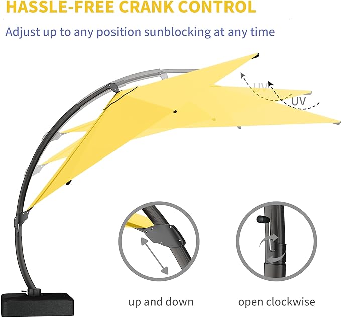 - 【360° Rotation & Infinite Tilt for Full Sun Control】Maximize shade coverage with smooth 360° rotation and precise infinite tilt adjustment. Easily block sunlight from any angle—perfect for poolside relaxation, patio dining, or backyard gatherings.